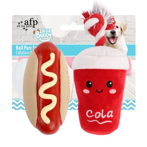 AFP All For Paws Little Buddy Ball Parc S Dog Toys are playful, food‑inspired dog toys designed to bring fun, comfort, and visual excitement to your dog’s daily playtime. Featuring two adorable designs—a hot dog–style plush toy and a cola cup–shaped plush toy—this set combines soft textures with engaging shapes that encourage interactive play and gentle chewing.
