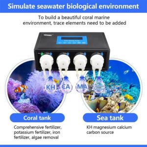 Programmable auto titration pump for marine coral reef tanks, 4-channel dosing heads with 8 titration long hoses. It helps to simulate the marine environment and maintain the ecological balance for a complete coral marine system. It is very suitable for adding CA/MG/AB water or other liquids to affect the growth and color of corals, helping to create a beautiful and unique saltwater coral tank.