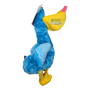 A: It’s a plush dog toy in the shape of a blue pelican character with wings, a yellow beak, and yellow feet.